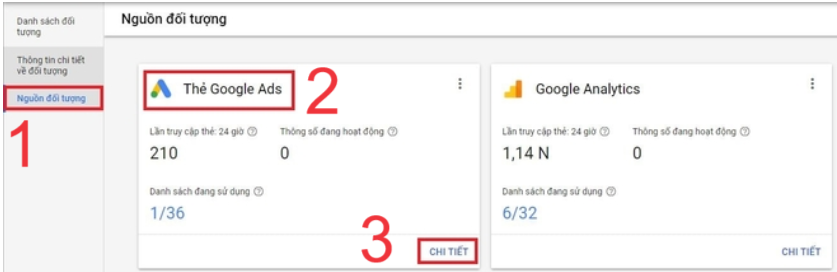 - Bước 3: Chọn tiếp “Nguồn đối tượng” → Thẻ “Google Ads” → Chọn “Chi tiết”