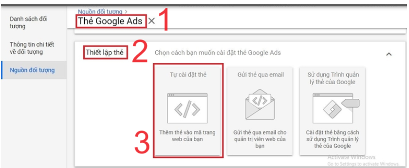 - Bước 4: Bạn lấy mã thẻ mã thẻ Remarketing bằng cách chọn “Tự cài đặt thẻ”