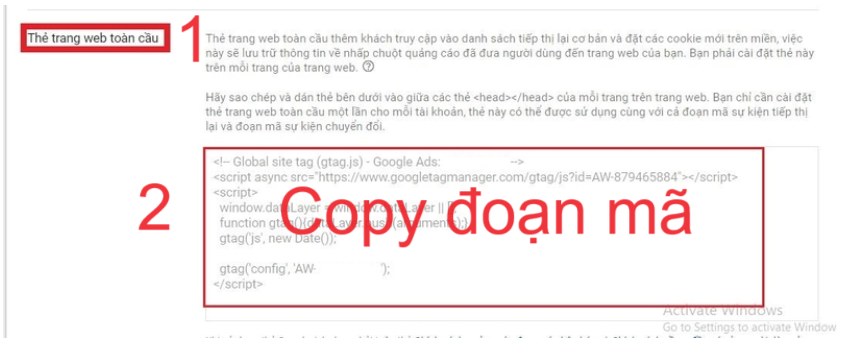 - Bước 5: Bạn copy lại toàn bộ đoạn Web tại “Thẻ trang web toàn cầu” rồi đưa mã Remarketing này đến các thiết kế Web của bạn