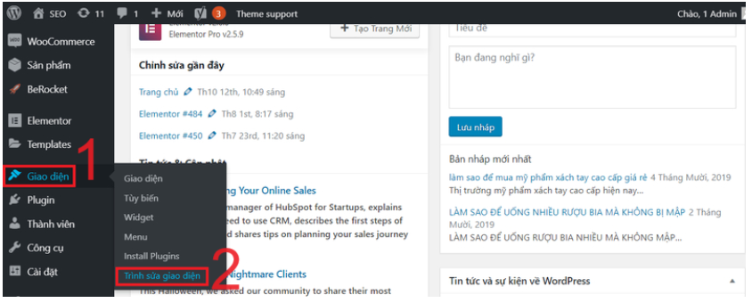 - Bước 1: Truy cập vào WordPress của bạn, tại thanh công cụ chọn “Giao diện” → Chọn tiếp “Trình sửa giao diện”